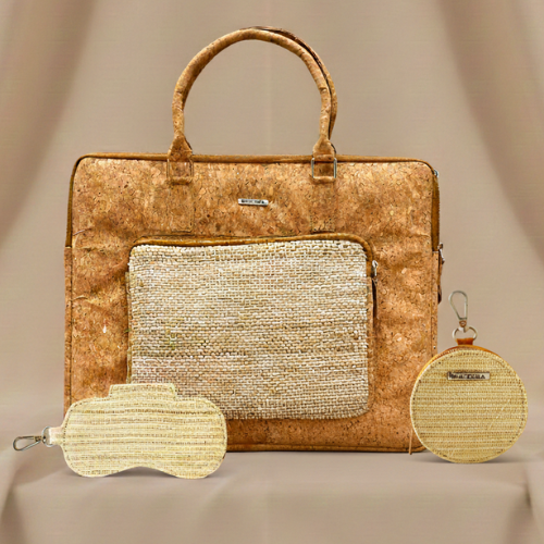 Luxury unisex laptop bag made from sustainable banana fiber and cork. Vegan laptop bag, handcrafted by rural women in India. Features stylish design, durable hardware, zip closure, and double non adjustable straps. Single compartment with...