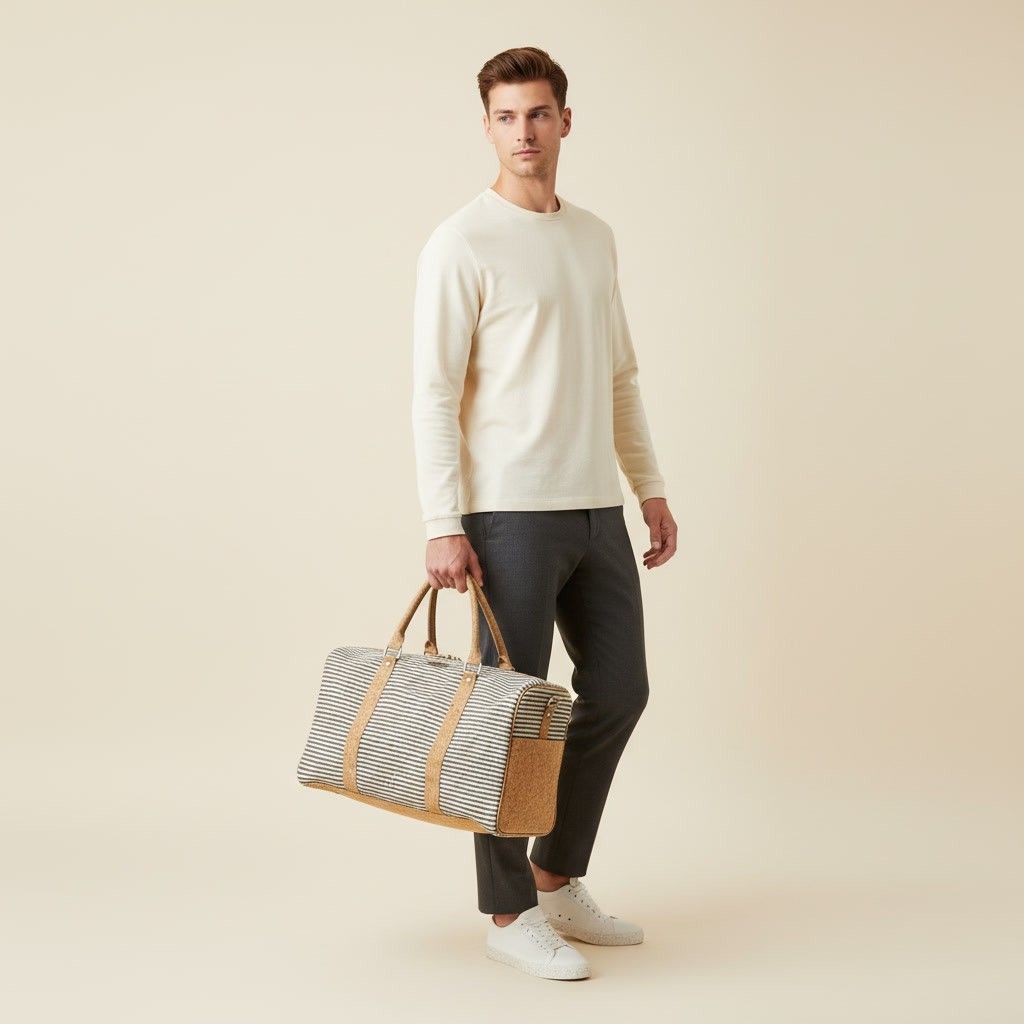 The Banio Voyager is a premium eco luxury travel Duffel bag for men & women designed for modern travellers and professionals. Handcrafted from banana fiber and natural cork, it combines durable, sustainable materials with a minimalist yet functional design. With ample compartments for your essentials, trolley strap and small accessories, the Banio Voyager ensures organised, effortless travel. Its adjustable straps and lightweight construction make it ideal for travel, or daily commutes, while showcasing ethical craftsmanship and eco conscious luxury. Luggage bag for tours and trips.