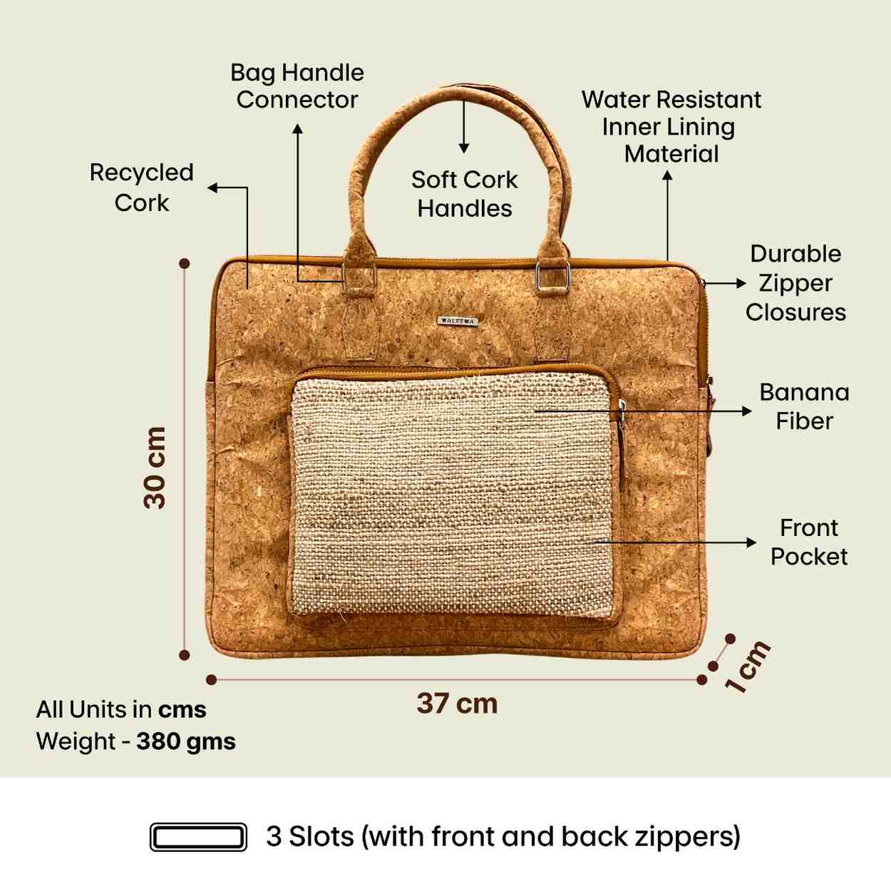 Luxury unisex laptop bag made from sustainable banana fiber and cork. Vegan laptop bag, handcrafted by rural women in India. Features stylish design, durable hardware, zip closure, and double non adjustable straps. Single compartment with padded laptop sleeve (fits up to 13 inch) and phone, key, and pen, diary. Ideal for office, travel, daily use, or casual wear. Vegan Laptop bag, office bag, business bag for daily use.