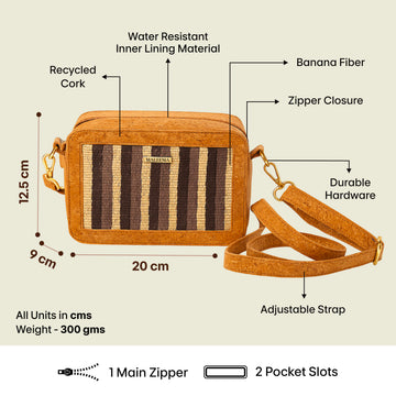 Sturdy and durable sling bag with zip closure and adjustable single shoulder strap. Features a single main compartment, internal zipper pocket, and back slip pocket for quick access. Made from sustainable banana fiber and cork, this vegan bag is ideal as a luxury unisex sling for daily use, office, travel, or casual wear.